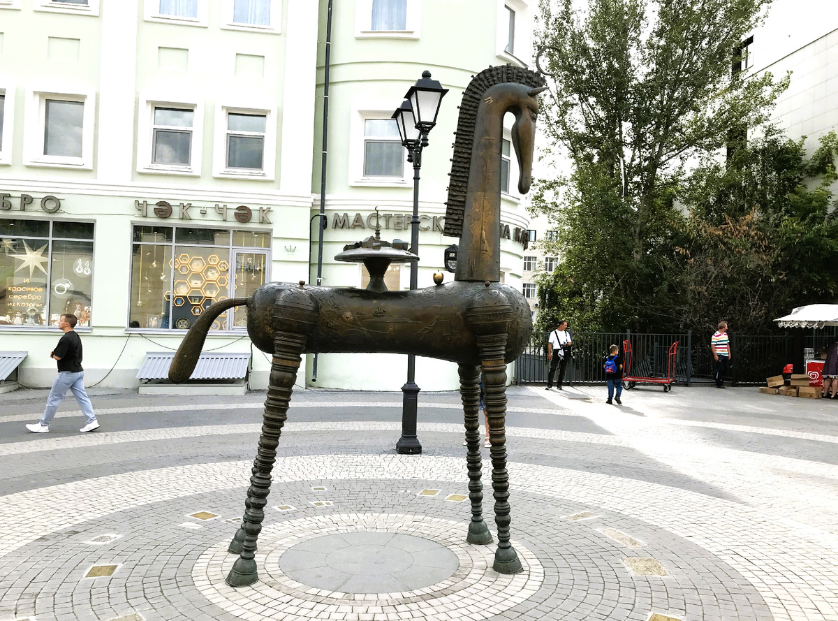 Казань – город древний, с богатой красочной историей, и с городом нашим связано множество легенд, сказаний и историй. По мотивам некоторых из них созданы скульптуры, я писала об этом раньше. А на улице Баумана, в центре Казани, стоит бронзовый конь высотой 4 метра. Конь настолько фантастический, что многие прохожие и вовсе не узнают в скульптурном изображении коня. Называется скульптура «Конь-страна», установлена она в 2018 году напротив одного из входов в метро. Внизу – станция «Кремлёвская» – кстати, самая красивая, на мой взгляд, станция казанского метро. Она украшена иллюстрациями сказаний о городе. Станция неглубокая, но впечатления от того, как она оформлена – волшебные. Очень советую спуститься и рассмотреть подробно все мозаики и изображения. Но вернёмся к нашему коню. Автор этого оригинального произведения – известный скульптор Рафаэль Сайфуллин. Когда его спросили, какие идеи он вложил в своё произведение, он ответил, что скульптура посвящена любви к родной стороне, к родному