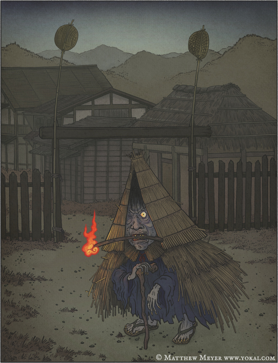 Еще одна старушка-ёкай, которая бродит по Японии в зимние месяцы – Микари-баба. От тех, о ком мы рассказывали раньше, она отличается тем, что у нее всего один глаз, а во рту горящий факел, а еще они собирают сведения о людях… Микари-баба — ёкаи, которые выглядят как старухи с одним глазом. Они часто носят ветхие старые соломенные шляпы и пальто, а во рту держат горящий факел. Они появляются зимой и пробираются в деревни, чтобы украсть плащи, корзины для веялок и глаза у людей.