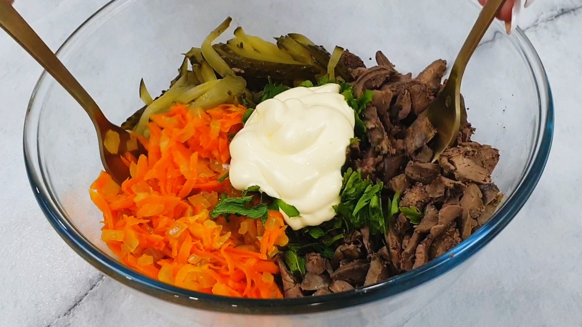 Когда печень остынет, нарежьте её соломкой. В салатнице соедините печень, зажарку из лука и моркови, нарезанные огурцы и рубленую петрушку. Заправьте салат майонезом и тщательно перемешайте. Готово!