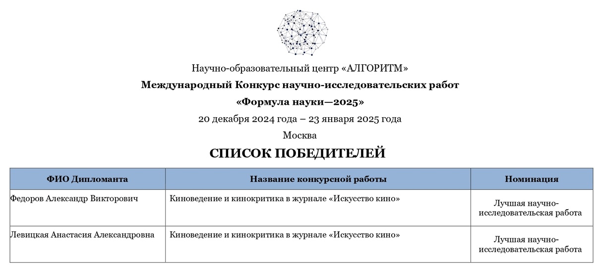 Федоров А.В., Левицкая А.А. Журнал «Советский экран»: мнения кинокритиков и читателей. М.: ОД «Информация для всех», 2025. 590 с. Федоров А.В., Левицкая А.А., Горбаткова О.И. Киноведение и кинокритика в журнале «Искусство кино». М.: ОД «Информация для всех», 2025. 403 с. Обе эти монографии можно прочесть в свободном доступе, без логина и пароля в Интернете на сайте издательства ОД "Информация для всех"
