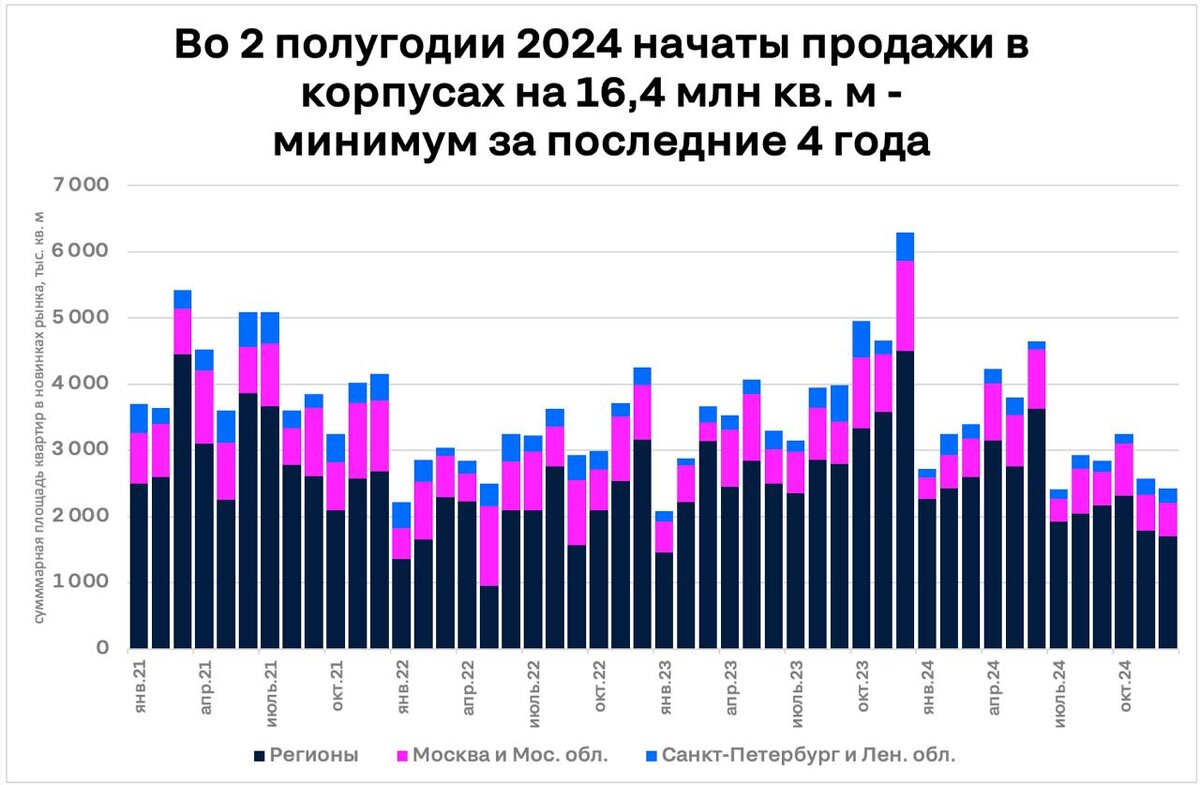 Речь идёт про период июль-декабрь 2024 год: в экспозицию вышли новые корпуса общей площадью 16,4 млн кв. м. «Даже в I полугодии 2022 (когда будущее отрасли выглядело куда неопределеннее) показатель был чуть выше (16,7 млн кв. м). Спад от фоновых значений последних лет составил -27%»,— заявили в ЦИАН. Среди причин такого падения вывода новостроек аналитики называют удорожание бридж-кредитов для приобретения участков, ужесточение оценки проектов в банках, более осторожное планирование со стороны самих застройщиков.