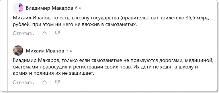 Возмущенная общественность не замедлила высказаться: да давно пора! Распоясались эти самозанятые до предела: в школах детей учат (сдать ЕГЭ 25 репетиторов, как у всех, но "это другое"), у врачей лечатся ("это у вас что-то, вот назначения на 25 тыр" - "это другое"), по дорогам ездят (транспортный налог от формы занятости не зависит вообще никак, но "это другое") - а сами плотють только 4% налогов! А честные труженики в найме - все 12! Получается, наемные доплачивают за самозанятых! Возмутительно - не то, что ничего им не оплачивать - еще лишить врачей и школ! И по дорогам запретить ездить, я так полагаю, было бы логичным продолжением требований. Потому что - а почему государство должно за их больничные платить?!