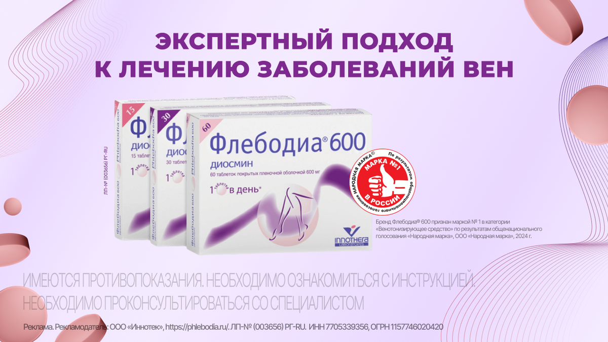 Если ноги сковало тяжестью, усталость не даёт вести активную жизнь, а ощущение распирания в ногах и отёки не дают надеть любимую пару обуви, на помощь придёт Флебодиа® 600. Флебодиа® 600 – это венотонизирующее средство, которое помогает облегчить симптомы варикоза: ✔️ Уменьшить утомляемость и боль в ногах ✔️ Снять ощущение тяжести ✔️ Уменьшить отёки Уже 2 года подряд Флебодиа® 600 является лауреатом премии «Марка № 1 в России» в категории «Венотонизирующее средство». Почему выбирают Флебодиа® 600: ✅ Удобный приём: всего одна таблетка в день ✅ Эффективность: клинически подтверждённое уменьшение тяжести симптомов варикоза ✅ Европейское качество: препарат от компании «ИННОТЕК» из Франции Нам доверяют люди, а мы рады, что Флебодиа® 600 дарит вашим ногам лёгкость 🌸 Источники:
