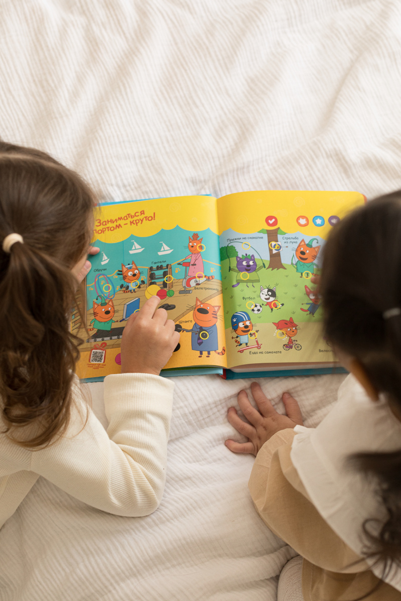 Для поддержания настроя подарите малышу Нажималку от BertToys «Три кота». И дело даже не в том, что эта интерактивная книга содержит много полезной информации для подрастающего непоседы; и что интересные факты об окружающем мире и жизни в целом рассказаны персонажами популярного мультфильма. Кроме этих достоинств, в ней есть целый разворот под названием «Наш веселый день», и вторым пунктом ежедневного распорядка идет зарядка. Когда малыш узнает, что даже герои любимого мультсериала делают каждый день зарядку, и увидит, с какими лицами они делают упражнения, у него возникнет такое же позитивное отношение к домашней физкультуре, которую проводят его мама или папа.