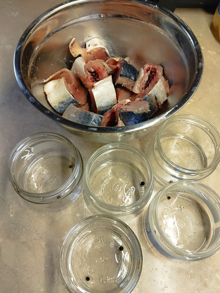Я продолжаю осваивать автоклав. Сегодня делаю консервы из скумбрии в масле. Купила упаковку мороженной скумбрии, там было 4 небольших рыбки. Почистила, порезала. Получилось 600 гр кусочков. Добавила 6гр соли, размешала. Взяла баночки по 250мл. В каждую баночку положила по кусочку лаврового листа, пару горошин черного перца. Разложила по 3 кусочка рыбы. Добавила по 2 ст.л воды и по две ложки масла. Крышки довела до кипения, чтобы размягчилась прокладка. Закрыла банки и поставила в автоклав. Стерилизовать на 115С 40 минут. Как остынут, можно доставать. Консервам нужно дать месяц настояться, чтобы набрали вкус, а потом уже пробовать.