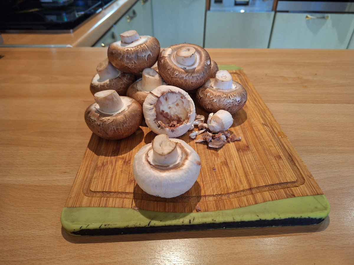 Царская закуска. Фаршированные шампиньоны. Средние шампиньоны 10 шт. Лук 1 шт. средний Бекон 10 полосок (варено-копчёный) Творожный сыр 1 ст.ложка(можно заменить майонезом) Сыр твёрдый 20 гр Укроп 2 веточки Из грибов вынуть ножки. Верхний слой шляпок снять. Вынуть внутренности из шляпок. Ножки нарезаем мелко. Обжариваем лук (нарезанный мелко) до мягкости на растительном масле. Добавляем грибные ножки и что извлекли из шляпок. Жарим 2 мин на сильном огне. Даём остыть и добавляем творожный сыр, твёрдый сыр ( на мелкой тёрке), укроп. Посолить по вкусу. Заполняем шляпки и оборачиваем беконом. Закрепляем зубочисткой и в духовку 180 гр на 20-25 мин. Получается очень вкусная закуска. Хороша как в горячем виде так и в холодном. Приятного аппетита!