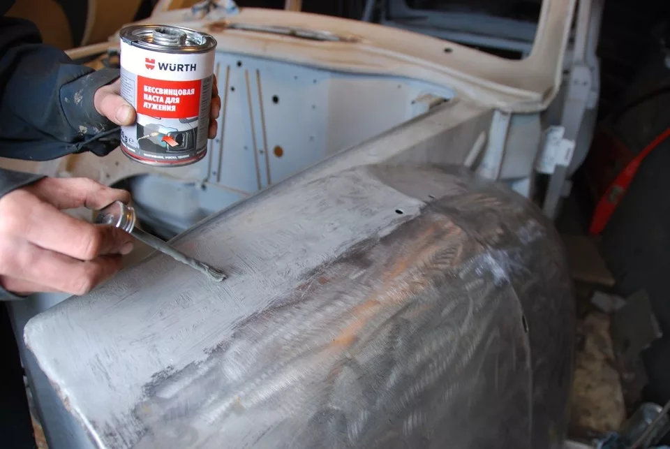 Кузовной ремонт оловом (лужение) — это метод, при котором на металлическую поверхность наносят расплавленный сплав олова. Олово прочное и пластичное, обеспечивает высокую механическую связь с поверхностью. Оно не только выравнивает, но и укрепляет металл, который ослаб после счищения ржавчины или правки вмятин. Некоторые ситуации, когда применяют лужение: Давайте разберемся, удобно ли это, и скроет ли данный способ ремонта от толщиномера? Припой обладает гораздо более высокими механическими свойствами, чем шпатлёвка. И в первую очередь нам важны механические свойства в месте перехода от металла кузова к материалу – заполнителю. Очень часто бывает такое, что слой шпатлёвки сам по себе остаётся целостным, не крошится и не трескается, но в следствие удара или вибрации, отслаивается от кузова прямо по поверхности контакта. При пайке связь между припоем и паяемым металлом образовывается на атомном уровне, отслаивание припоя от металла невозможно в принципе, если соблюдена технология. Так