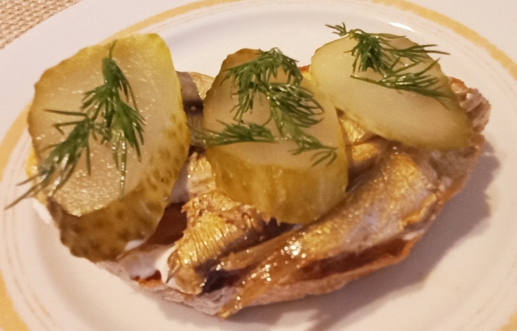 В нашей молодости в советские времена шпроты не лежали на прилавках магазинов, как и многое другое. Их давали в продуктовых наборах к праздникам. А праздников-то было не так много: новый год, 7 ноября, 1 и 9 мая мая, 8 марта... Таким образом, заветная баночка шпрот была доступна лишь несколько раз в году и то не в каждом наборе. Народ придумывал разные закуски с ними, а эта самая любимая и простая в приготовлении. Прежде всего поджариваем ломтики хлеба: делали мы это в духовке или на сковороде - тостеров практически ни у кого не было. У моих знакомых точно. Далее работаем с майонезом ( он кстати тоже не всегда лежал на прилавках, но был вкуснее и продавался в стеклянных баночках). Выдавливаем через пресс чеснок (берем по вкусу) и соединяем с майонезом. Перемешиваем. Далее нарезаем огурчики. Их можно использовать как соленые, так и маринованные. Дело вкуса или что есть в наличии. Намазываем каждый ломтик майонезом с чесноком. Сверху выкладываем рыбёшку. Тогда мы делали маленькие бу