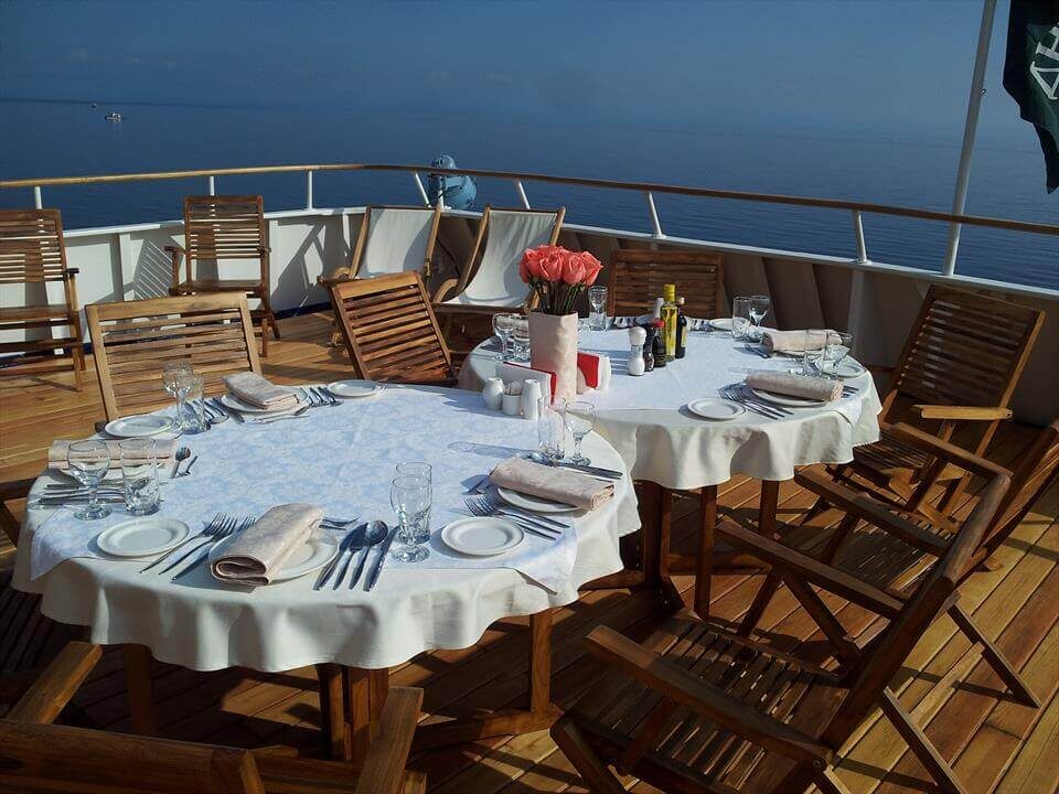 На шлюпочной палубе, как правило, находятся главные развлечения. На «Северной сказке» это солярий, концертный зал и панорамный ресторан. Отсюда открывается лучший обзор на окрестности, поэтому именно здесь расположены каюты класса полулюкс и люкс.