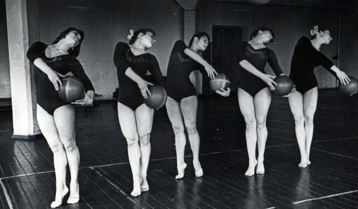 На фото – грациозные гимнастки, выполняющие синхронное упражнение с мячами. Их точные, выверенные движения подчёркивают силу и гибкость. Этот снимок демонстрирует высокий уровень подготовки спортсменок того времени и эстетическую составляющую художественной гимнастики.