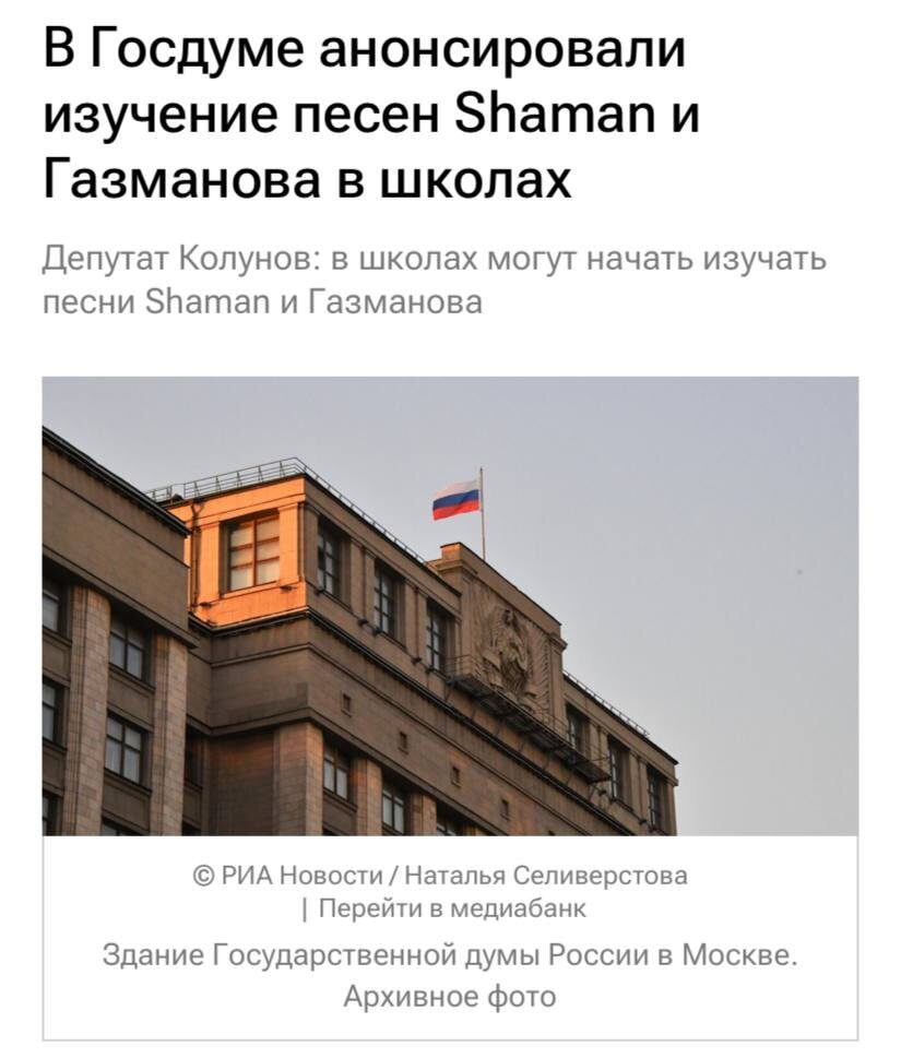 Песни Shaman и Олега Газманова могут начать изучать в школах Школьники 1-8 классов с 1 сентября 2025 года могут начать изучение патриотических песен современных авторов в рамках уроков музыки, рассказал депутат Госдумы Сергей Колунов. В палате рассказали, что через месяц будет составлен рабочий вариант песенника, который в будущем будут изучать школьники в рамках урока музыки. Все обсуждения обещают закончить к лету.