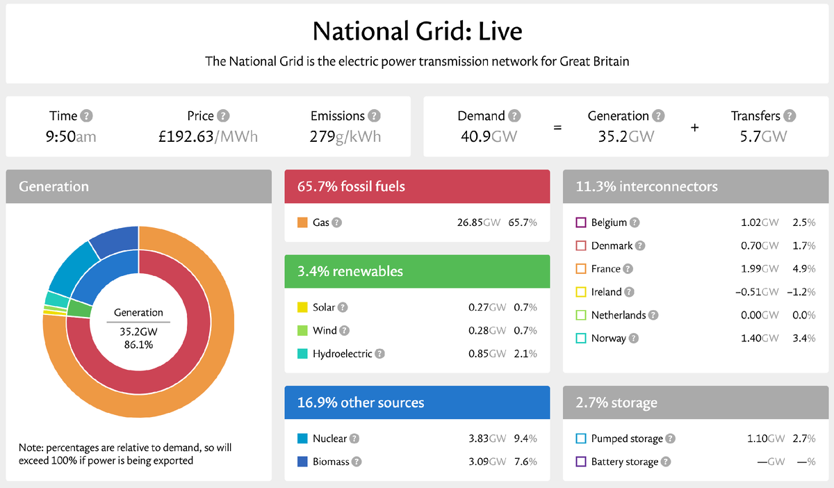 Крутая штука: у британцев есть дашборд, который в реальном времени показывает, сколько тратят электричества и из каких источников оно поступает в общую электросеть. Дашборд, кстати, сделала журналистка и он в open source, как и данные, которые он использует для отображения. У них только что закончился Dunkelflaute — «тёмное затишье», длительный период, когда и темно большую часть суток, и нет ветра, поэтому ни солнечные, ни ветряные электростанции не вырабатывают достаточно электричества, и их доля в потреблении падает до ≈0. В это время приходится переходить на газ, закупать электричество за рубежом, а на это есть всякие государственные ограничения и барьеры, в том числе потому что цены на электричества растут и людям это не нравится. И вот ветер с 1-2 узлов/ч в среду сегодня поднялся до 12-15 узлов/ч, и доля энергии от возобновляемых источников выросла до обычных средних 30%. Dunkelflaute закончился!