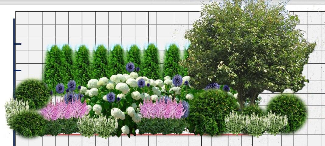Это не окончательный вариант. Еще буду думать, но, знаете, что заметила, планируя эту композицию. Вообще не думала в эту сторону, когда смотрела на эту часть сада, находясь на участке. Это часть перед домом. Справа яблоня Оля. Она уже растет. Кто смотрел мои ролики, помните, где я рассказывала, как за яблоней посадила спирею серую, чтобы от земли до кроны дерева вид на участок соседки был скрыт. Вот как раз эта часть сада на картинке. Вдоль изгороди из туй Смарагд до этой яблони. Но что заметила. Слева на одной картинке стриженный куст есть, на другой-нет. Даже в мыслях не было слева сажать, какой-то высокий кустарник на ножке. Но когда на картинке стала смотреть. Ощущение, что чего-то не хватает. Вставила кустарник на ножке и стало как-то лучше, мне кажется. Но в целом есть сомнения, как астильба с мордовником будет смотреться в жизни.