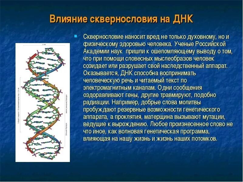 (Начало читайте в предыдущей статье "О сквернословии поднебесном" И это подтвердил в конце ХХ века основатель института квантовой генетики биолог Пётр Гаряев. Им был создан аппарат,превращающий слова в электромагнитные колебания. Он установил, что матерные слова равны по силе мощному радиоактивному облучению. Мат, как одно из средств проклятия страшнее мины взрывает генетику человека, искажая его наследственные программы, вызывая мутации чудовищной силы, приводящие к вырождению. Во время отборной брани корёжатся и рвутся хромосомы. Академик Гаряев заявил, что слово может исцелять, а может вызвать рак и быть убийцей. «Мат приводит к уродству в потомстве и тотальному вырождению нации, это оружие массового поражения, причём не столько убийственное, сколько самоубийственное». Если бы человек увидел, какой мощности удар он наносит скверным словом себе, окружающим людям и особенно детям, он никогда бы его не произнёс. А если скверну произносит мать, то она на