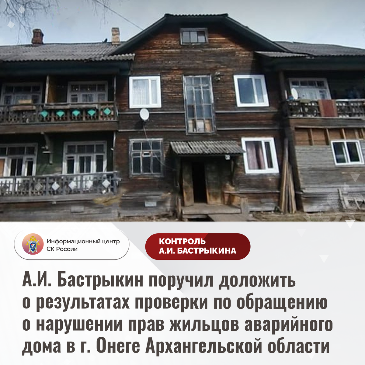 А.И. Бастрыкин поручил доложить о результатах проверки по обращению о нарушении прав жильцов аварийного дома в г. Онеге Архангельской области В приемную Председателя СК России А.И. Бастрыкина «ВКонтакте» обратилась жительница Архангельской области по вопросу длительного нерасселения многоквартирного дома, 1953 года постройки, на улице Индустриальной в городе Онеге. В 2019 году здание ввиду высокой степени износа конструкций признано аварийным, в настоящее время в непригодном состоянии находятся кровля и печь, деревянные конструкции разрушаются. Однако мер к предоставлению жильцам благоустроенных квартир не принимается, сроки расселения затягиваются. Обращения граждан проигнорированы. В СУ СК России по Архангельской области и Ненецкому автономному округу по поступившему обращению начата процессуальная проверка. Председатель Следственного комитета Российской Федерации Александр Иванович Бастрыкин поручил руководителю СУ СК России по Архангельской области и Ненецкому автономному округу А