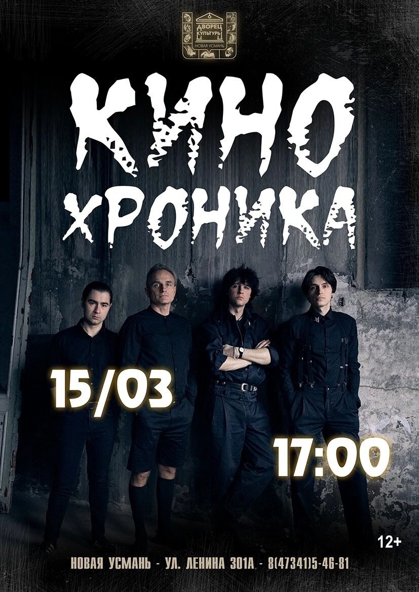 Вечер 15 марта превратится в музыкально-театральное путешествие! На сцене Дворца Культуры с.Новая Усмань выступит единственный в России трибьют группы "Кино". Музыканты искусно воссоздадут атмосферу концертов В.Цоя и "Кино", оставивших неизгладимый след в сердцах поклонников. "КИНОхроника" предложит зрителям насладиться живым исполнением любимых композиций, будто они вернулись во времена юности "Кино". Все музыканты подобраны по типажу и внешнему сходству с музыкантами группы "Кино". Вы ощутите их искреннюю любовь и настоящую энергетику! Инструменты, костюмы и даже аксессуары в результате скрупулёзных стараний полностью соответствуют оригинальным. А главный герой настолько глубоко погружается в образ Виктора Цоя, настолько идентично передает все движения, голос и манеру вокала, что возникает иллюзия реального присутствия на концерте легенды! Не упустите возможность окунуться в атмосферу СССР и почувствовать искреннюю энергетику выступления. Билеты на концерт группы "Кино" доступ