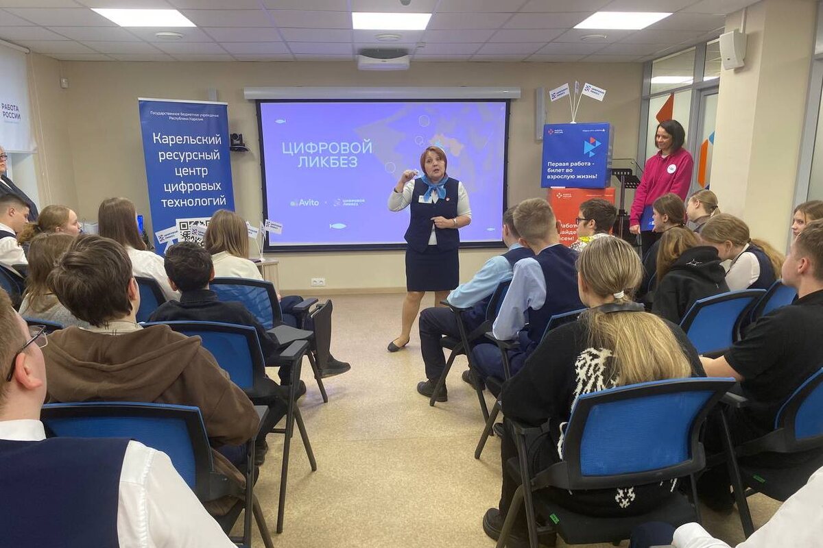 Фото: Администрация Главы Республики Карелия Молодежи рассказали, как при помощи современных технологий получить свой первый трудовой опыт, но сделать это безопасно. 16 января прошло первое занятие Всероссийского просветительского проекта «Цифровой ликбез» в Кадровом центре Петрозаводска. В мероприятии приняли ученики восьмых классов Университетского лицея, так как недавно они получили паспорта и теперь могут официально трудоустроиться. В начале мероприятия к ребятам обратился заместитель начальника Управления информатизации и защиты информации Юрий Мишков: «Вы находитесь на пороге выбора своей будущей профессии. И хотя в запасе у вас есть время, но познакомиться с миром профессий, попробовать себя в них, получить этот важный опыт можно уже сейчас. В современном мире цифровизация открывает новые возможности, позволяя быстрее и проще находить товары, услуги, в том числе и искать работу. Но при однозначном удобстве и продуктивности работы с онлайн-платформами очень важно помнить о безопа