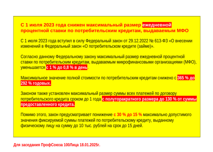 С 1 июля 2023 года снижен максимальный размер ежедневной процентной ставки по потребительским кредитам, выдаваемым МФО С 1 июля 2023 года вступил в силу Федеральный закон от 29.12.2022 № 613-ФЗ «О внесении изменений в Федеральный закон «О потребительском кредите (займе)». Согласно данному Федеральному закону максимальный размер ежедневной процентной ставки по потребительским кредитам, выдаваемым микрофинансовыми организациями (МФО), уменьшается с 1 % до 0,8 % в день. Максимальное значение полной стоимости по потребительским кредитам снижено с 365 % до 292 % годовых. Законом также установлен максимальный размер суммы всех платежей по договору потребительского кредита сроком до 1 года с полуторакратного размера до 130 % от суммы предоставленного кредита. Помимо этого, закон предусматривает понижение с 30 % до 15 % максимально допустимого значения фиксируемой суммы платежей по потребительскому кредиту, выданному физическому лицу на сумму до 10 тыс. рублей на срок до 15 дней