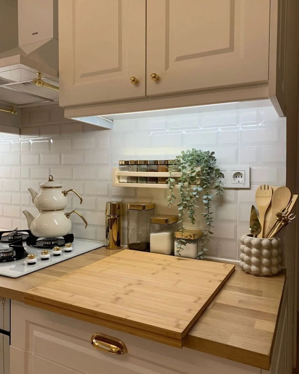 Н у и финишем если вы уж взялись за светлые и золотистые оттенки то позаботьтесь о том, чтобы либо закрыть посудомойка фасадом как у остальной мебели, либо взять тупо белую, ну или хотя бы как-то ее обыграть,