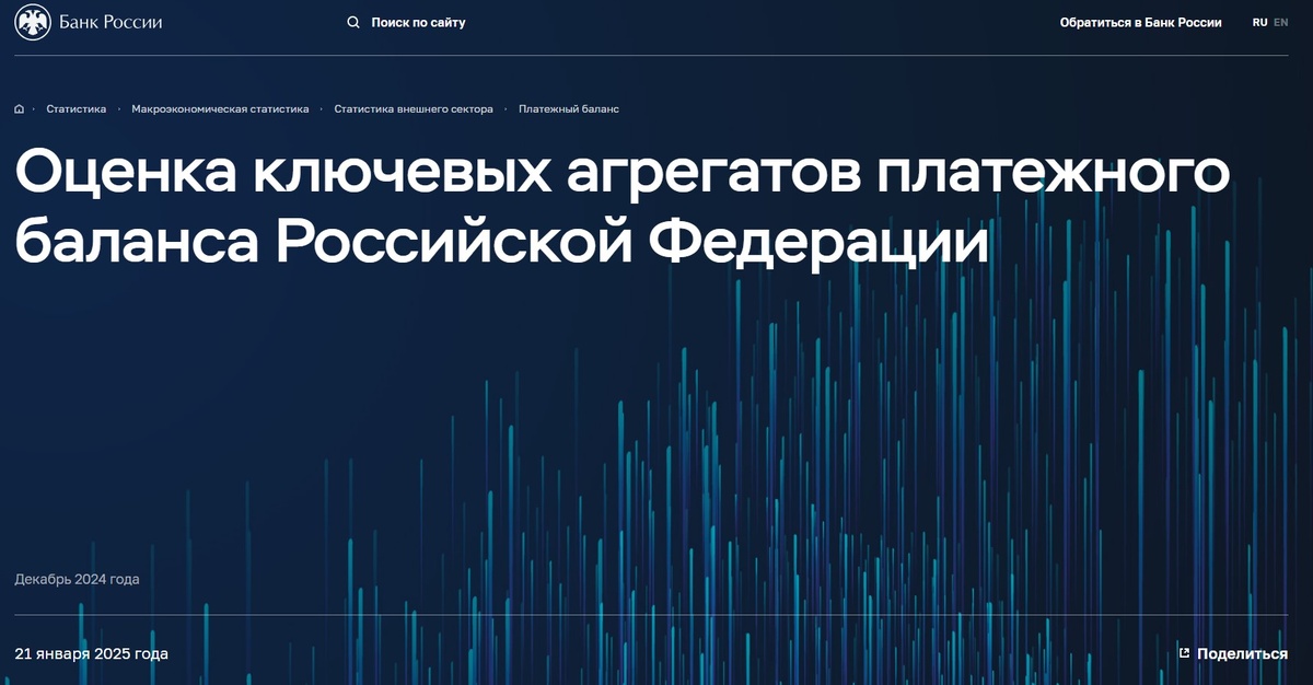 По мере публикации разных статистических данных, постепенно проясняются ответы на вопросы, которые еще нельзя было точно дать в конце 2024 года. В частности: Как вы помните, я много писал на эту тему, но все это тогда носило характер предположений. Потому что что там на самом деле происходит никто не знал - не было данных. И вот, важные данные появились, и предположения подтвердились. А именно: санкции повлияли существенно и прежде всего, на экспорт (через ГПБ велись расчеты именно за нефтегазовый экспорт), а также на приток в страну твердой валюты - все это в декабре рухнуло до серьезных минимумов. Да так, что существенно повлияло даже на общегодовые показатели, которые оказались хуже данных накануне прогнозов. Банк России опубликовал предварительную оценку показателей платежного баланса страны за 2024 год. Из нее видно следующее. Профицит платежного баланса по итогам года составил 53,8 млрд долларов, что оказалось заметно ниже и октябрьского прогноза самого ЦБ (61 млрд), и свежего ян