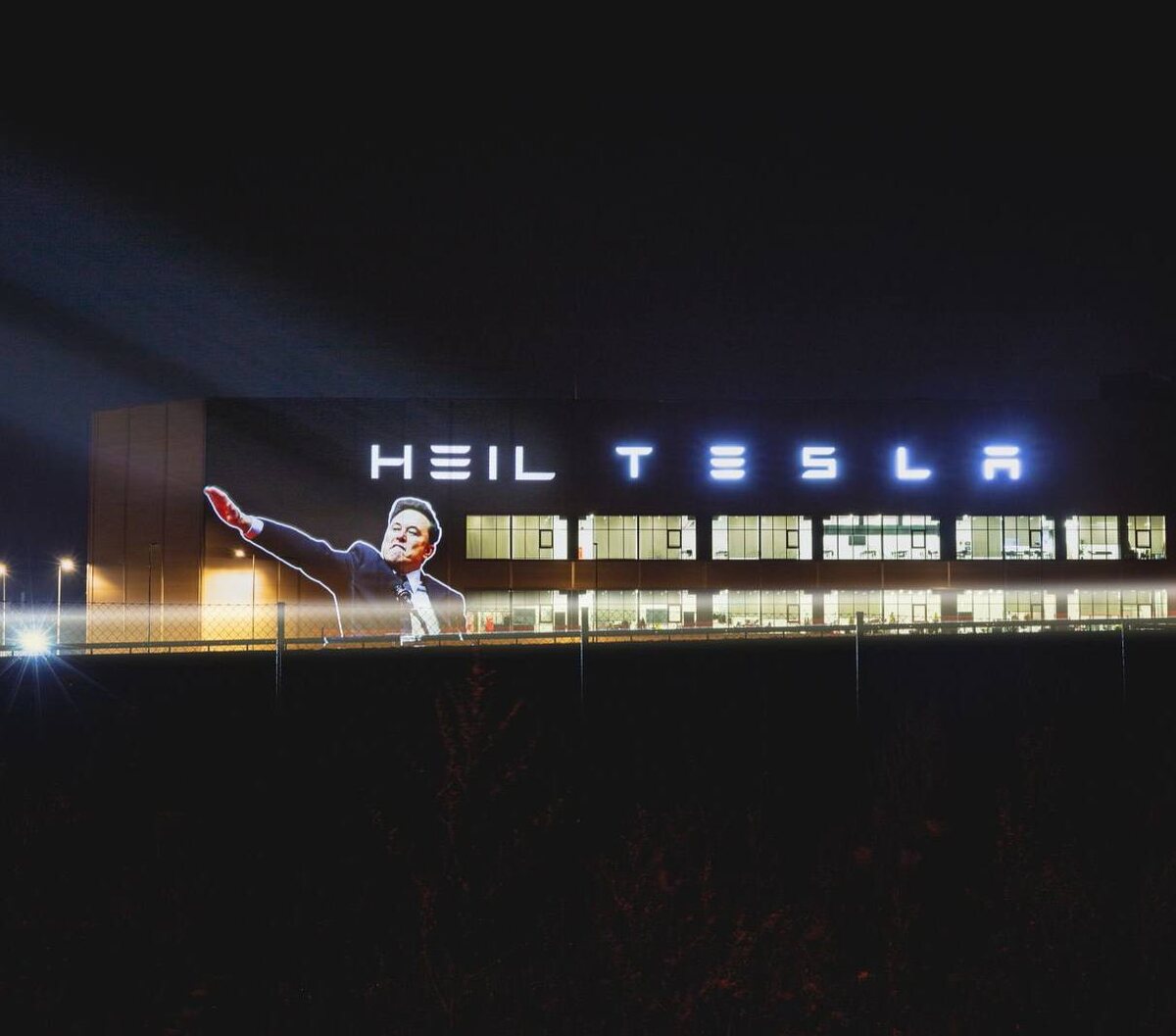 В Берлине активисты вывели проекцию римского салюта Илона Маска с подписью «heil» на завод Tesla.