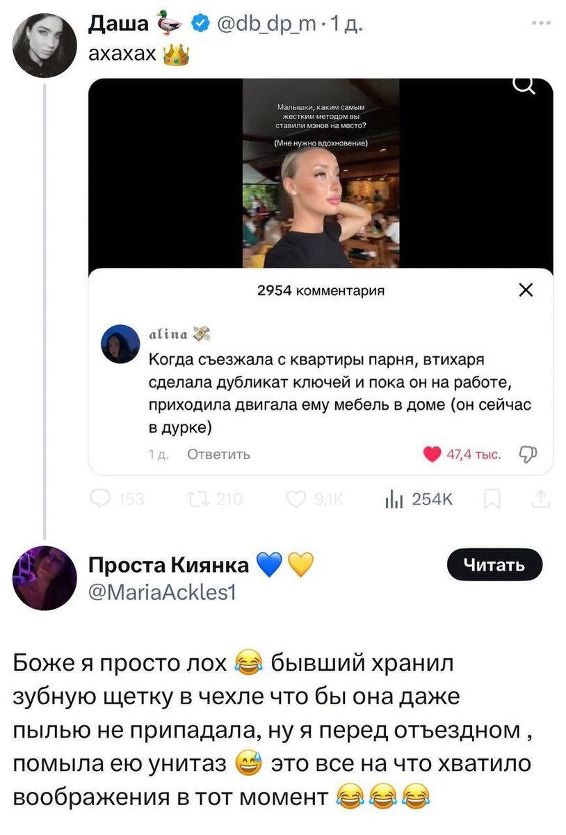 Мелкие пакостницы хвастаются: Почти 50 000 лайков и 3 000 одобрительных, надо полагать, комментов. Шуток юмора на эту тему полно: Отвечая на целевой запрос женской аудитории, зоопарки даже устраивают «День пожирателей бывших»: В честь праздника сотрудники зоопарка скормили сурикатам и рыбам тараканов, которым все желающие дали имена своих бывших вторых половинок. Народу на акции собралось немало. Это поможет людям справится с их внутренними переживаниями и отпустить прошлое, - рассказали в Екатеринбургском зоопарке. Такие вот страшные "приколы" в смешной обёртке. Неприкрытое пожелание смерти. Живому человеку, с которым мстительница недавно жила, ела, спала. Это какой-то чисто женский загон. Я не видел и не слышал ничего подобного в мужских компаниях: в старших классах школы, в институте, в самых разных рабочих коллективах и т.п. Не принято как-то у мужиков обсуждать прошедшие любови. В то же время знаю женщин, которых через 25 лет (!!!) после развода - колотить начинает при одном уп