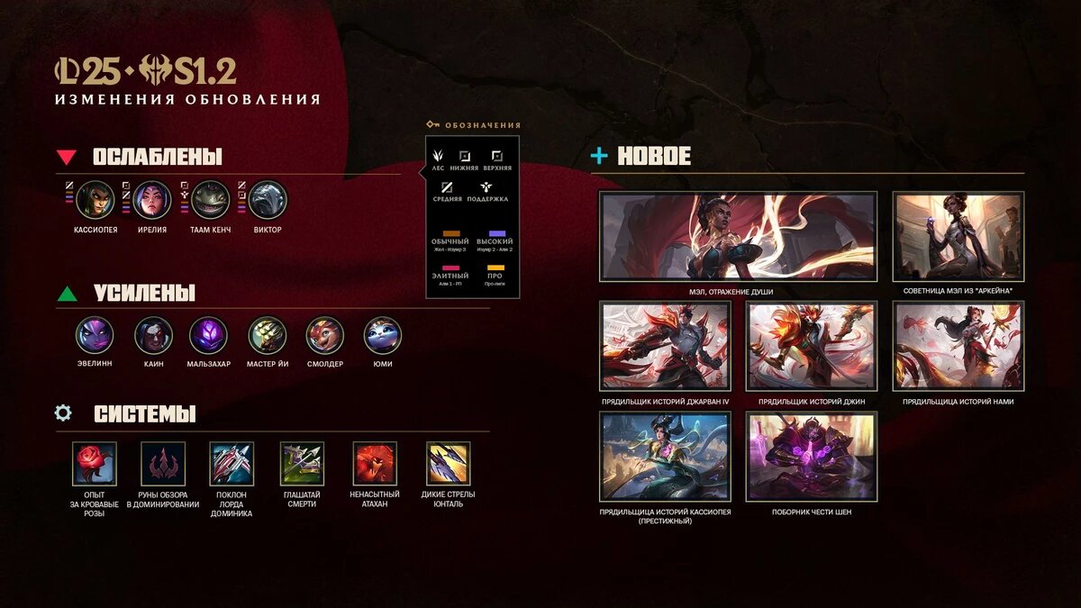 Первое в этом сезоне обновление для League of Legends содержит правки легкой игры, корректировку баланса ARAM, возвращение А.Р. У.Р.Ф. изменения чемпионов и добавление нового чемпиона Мэл. Новые сезонные механики немного изменены и доработаны. На смену Триумфу первой крови пришел Триумф кровопролития: для его активации команде необходимо убить трех чемпионов. За подбор кровавых роз и убийство Атахана теперь не такая высокая награда, а принцип выбора формы и места появления монстра стал лучше. Новые руны из пути Доминирования усилены. Увеличено общее количество синей эссенции, которую можно получить за прохождение вех пропуска, с 4750 до 9000. Кроме того, за прохождение финальных вех теперь будет даваться не 50 синей эссенции, а все 750. Поскольку пропуск первого акта стал доступен несколько недель назад, некоторые игроки уже успели пройти вехи с синей эссенцией. Чтобы компенсировать недостачу, было введено простое задание, за выполнение которого полагается 4250 синей эссенции. Мэл, Сов