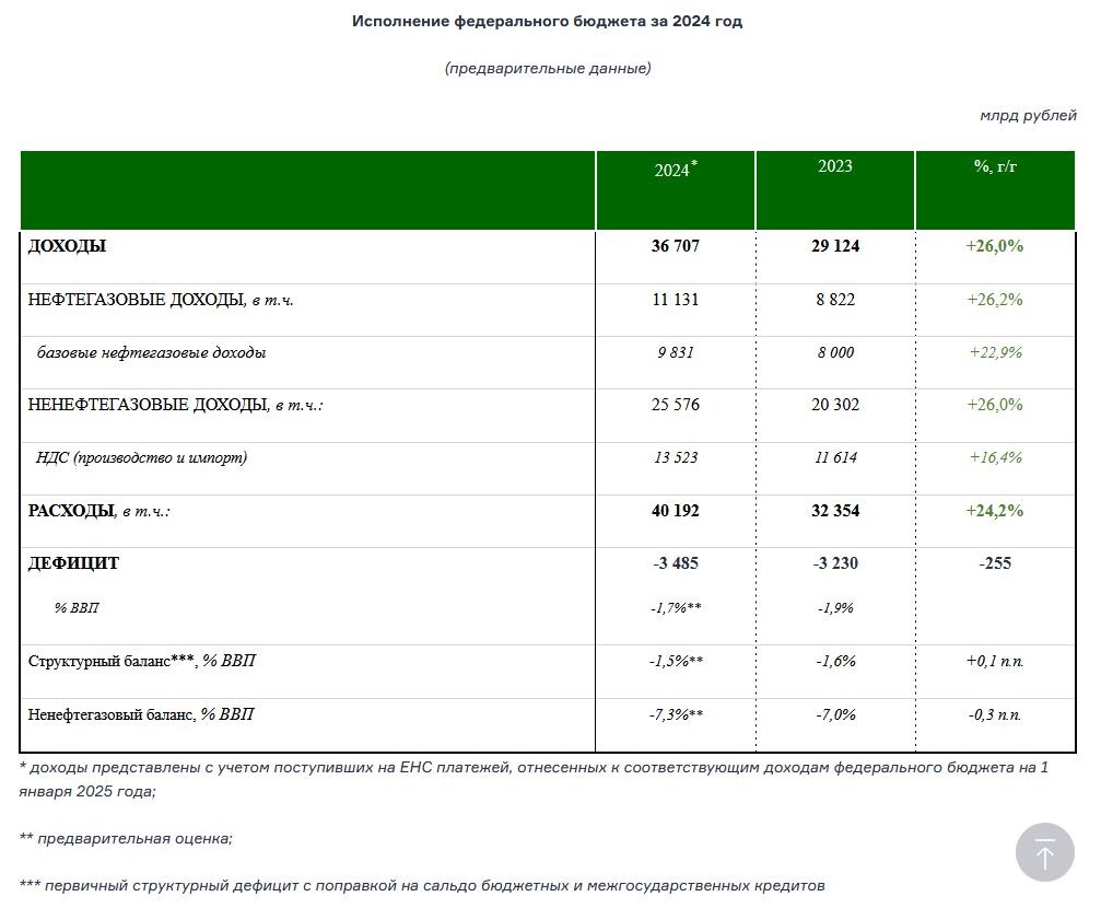 Бюджет-2024 трещит, но держится почти исключительно благодаря инфляции и падению рубля Прошлый год отметился не только высокой инфляцией и падением рубля. С госфинансами тоже было не все хорошо. ИТОГИ Госрасходы превысили первоначальный план на 3,5 трлн р. Доходы за ними не поспевали: они дали добавку только на половину этой суммы, на 1,6 трлн р. В итоге дефицит бюджета превышен более, чем вдвое: вместо 1,6 трлн р. по факту получили 3,5 трлн.р. Данные отсюда. Подробности ✔️ Доходы. К прошлому году они выросли на четверть. Мировые цены на нефть в 2024 были чуть пониже, чем в 2023, но благодаря падению рубля доходы бюджета выросли. Так же выросли и ненефтяные доходы, спасибо повышению налогов и инфляции. ✔️ Расходы. Скачок к прошлому году — почти на четверть. Расшифровку их минфин не приводит, но, вполне понятно, на что пошли сверхплановые траты. ✔️ Дефицит. Очень дорого при такой ключевой ставке ЦБР, занимать на рынке. Поэтому минфин частично профинансировал дефицит сокращением ФНБ на 1