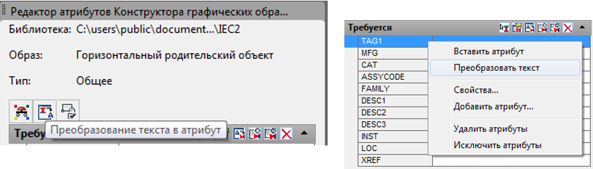 В «Конструкторе графических образов» при создании пользовательского компонента ранее введенные текстовые объекты AutoCAD (или объекты-атрибуты) можно преобразовать в атрибуты графического образа компонента AutoCAD Electrical. Для атрибутов разделов Требуется или Не обязательно используются следующие инструменты: Свойства выбранных объектов, такие как высота и значение, преобразуются в свойства атрибута компонента. При этом исходный текст или атрибут удаляется и заменяется выбранным атрибутом компонента AutoCAD Electrical. После запуска команды открывается диалоговое окно «Преобразование текста в атрибут», в котором в таблице «Текст» перечислены текстовые объекты, а в таблице «Атрибут» свободные атрибуты компонента AutoCAD Electrical. Использование инструмента контекстного меню начинается с выбора из списка необходимых атрибутов, которые будут преобразованы по очереди. В процессе преобразования атрибуты можно пропускать или в любой момент остановить процесс, нажав кнопку ESC. При запуск