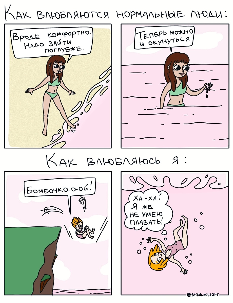 Раз уж сегодня на календаре 14 февраля, самое время выпустить какую-нибудь тематическую подборку в честь Дня всех влюбленных. В этот раз я решил не ограничиваться какой-то узкой тематикой вроде «День святого Валентина» или «Свидания» и просто отобрал для вас десятку свежих зарисовок на тему любви, отношения и всего тому-подобного. Так что сегодня вас ждут забавные комиксы и про влюбленность, и про первые свидания, и про моменты в долгих отношениях, и даже про свадьбу. Надеюсь, что вам понравится! И да - всех с праздником! Питерская художница Катя Цыганова, также известная под псевдонимом Stitch Military, рисует смешные комиксы о жизни одной молодой светловолосой девушки. В одной из недавних работ Катя решила наглядно показать, как могут влюбляться разные люди. Московский художник Дима Линг, также известный под псевдонимом Woostar, показал, как современные тренды могут негативно влиять на взаимоотношения между людьми. Проще говоря - слушать советы из интернета может быть не всегда хоро