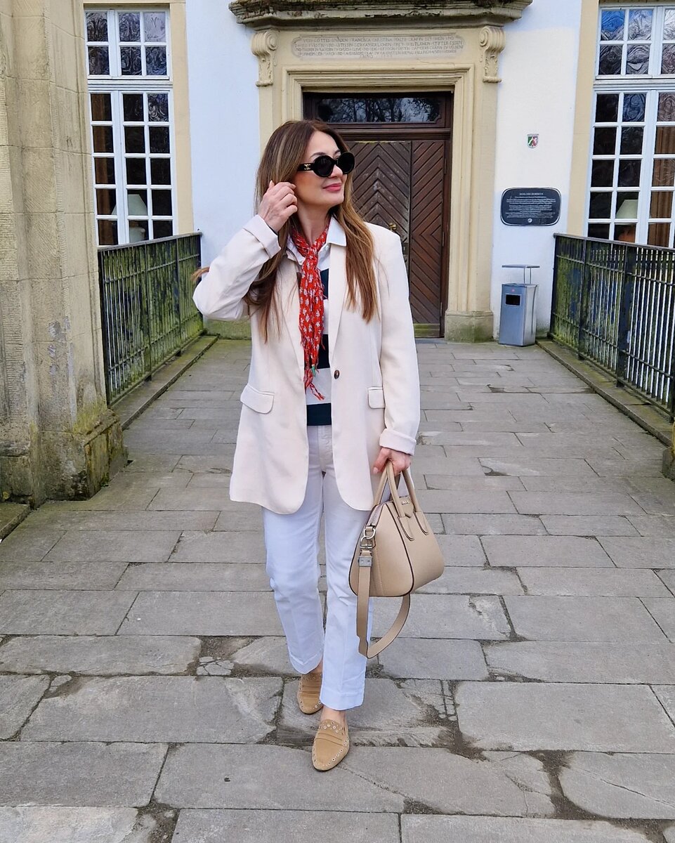 Чтобы чувствовать себя свободно и уверенно, не обязательно носить мешковатые фасоны оверсайз. Одежда по размеру тоже может быть комфортной. Классическая рубашка, джемпер, белые брюки, молочный жакет удлиненного кроя, лоферы, аксессуары и ничего лишнего!
