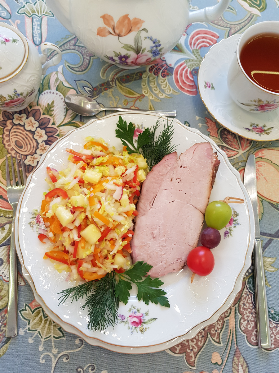 Добрый день, дорогие друзья! Сегодня я представляю вашему вниманию сочное, легкое блюдо — салат из овощей и ананаса. Для приготовления нам понадобятся: 1 качан пекинской капусты, 2 красных десертных перца, 2 оранжевых десертных перца, 2 ломтика свежего ананаса, 1 головка красного сладкого ялтинского лука, 1/2 лимона, 1/4 чайной ложки соли, 1 столовая ложка масла из виноградных косточек. Приготовление: капусту разрезать пополам, удалить кочерыжку, нарезать соломкой, посолить и помять руками. Ананасы нарезать кубиком, удалив жесткую сердцевину. Лук нарезать соломкой. Удалить плодоножку и семена у оранжевых перцев и нарезать их соломкой. Удалить плодоножку и семена у красных перцев и нарезать соломкой. Салат перемешать и заправить растительным маслом. Разложить салат по тарелкам, дополнить зеленью и запечённым мясом. Приятного аппетита!