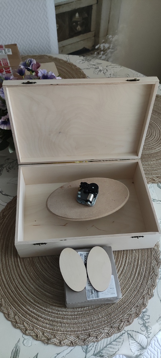Как повелось, беру максимально большой размер 200/300 мм. И дополнительные детали : готовые овалы из фанеры 3 мм, музыкальный механизм ..