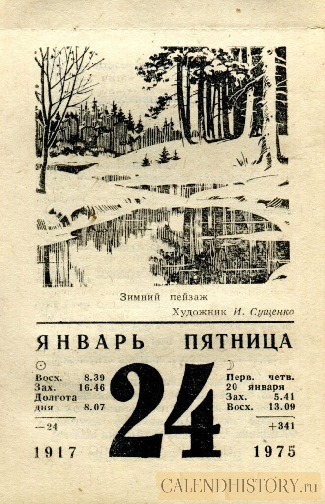 Итак, сегодня 24-го января и у нас на календаре 1975-й год. Перед нами листок советского календаря для женщин. На календаре у нас пятница - 24 января 1975-го года. Зимний пейзаж. Художник И. Сущенко *** Оборотную сторону листка этого календаря можно посмотреть у нас по ссылке на сайте. Другие листки советских календарей смотрите у нас на сайте - CALENDHISTORY.ru ПОСМОТРИТЕ ЕЩЁ ЛИСТКИ ОТРЫВНЫХ КАЛЕНДАРЕЙ: