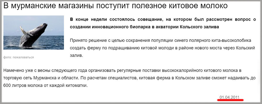 Раз в несколько лет, специально к первому апреля, в газетах публикуются заметки на тему создания молочных китовых ферм. Но не все люди смотрят в календарь, и день смеха тоже отмечают далеко не все, поэтому есть те, кто принимает эти публикации всерьез. А почему бы и нет, в самом деле? В заметках говорится о пользе китовьего молока и о перспективах создания подобных ферм. Вы только представьте: одна китоматка дает до 600 литров молока в сутки (хотя киты так-то разные по удойности). Это же какая выгода! Корова дает всего-то около 20 литров, а ведь ее еще кормить-поить надо. Одна китиха заменит 30 коров! Вопрос: как доить, не ограничивая в свободе? Так же, как доят лосих например. Они просто приходят к месту дойки в определённое время, а в остальное время ходят по лесу (лесному пастбищу, заповеднику), и сами себе ищут корм. Лосиные фермы свободного выпаса существуют давно. Теоретически, можно было бы вплавь добираться до китих, зная их места дислокации на период выкармливания китят, и