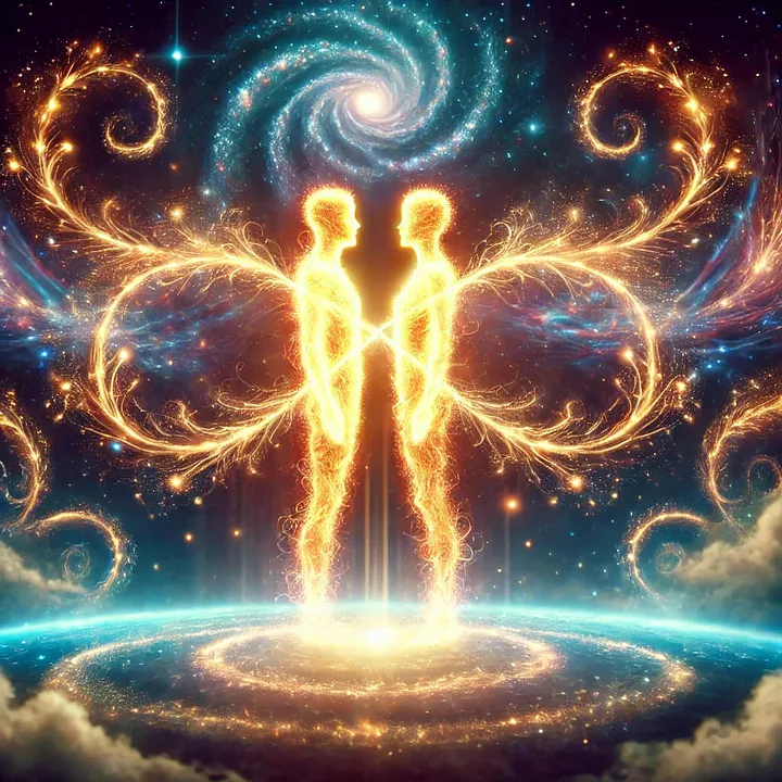 Представьте себе мощную, сверкающую душу, которая разделяется на две части. Каждая часть несёт в себе половину божественной искры, и между этими половинами всегда существует нерушимая энергетическая нить. Они могут перерождаться в разных воплощениях и проходить множество испытаний, но их тянет друг к другу космическая сила, которую невозможно разорвать.