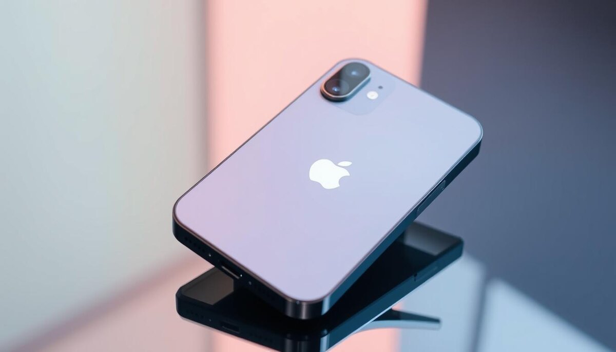 Элегантный современный iPhone 15 стоит на минималистичном столе, демонстрируя инновационный дизайн и яркий дисплей, в окружении мягкого окружающего освещения, которое подчеркивает особенности и текстуры устройства с акцентом на гладкие грани и передовые материалы, использованные в его конструкции