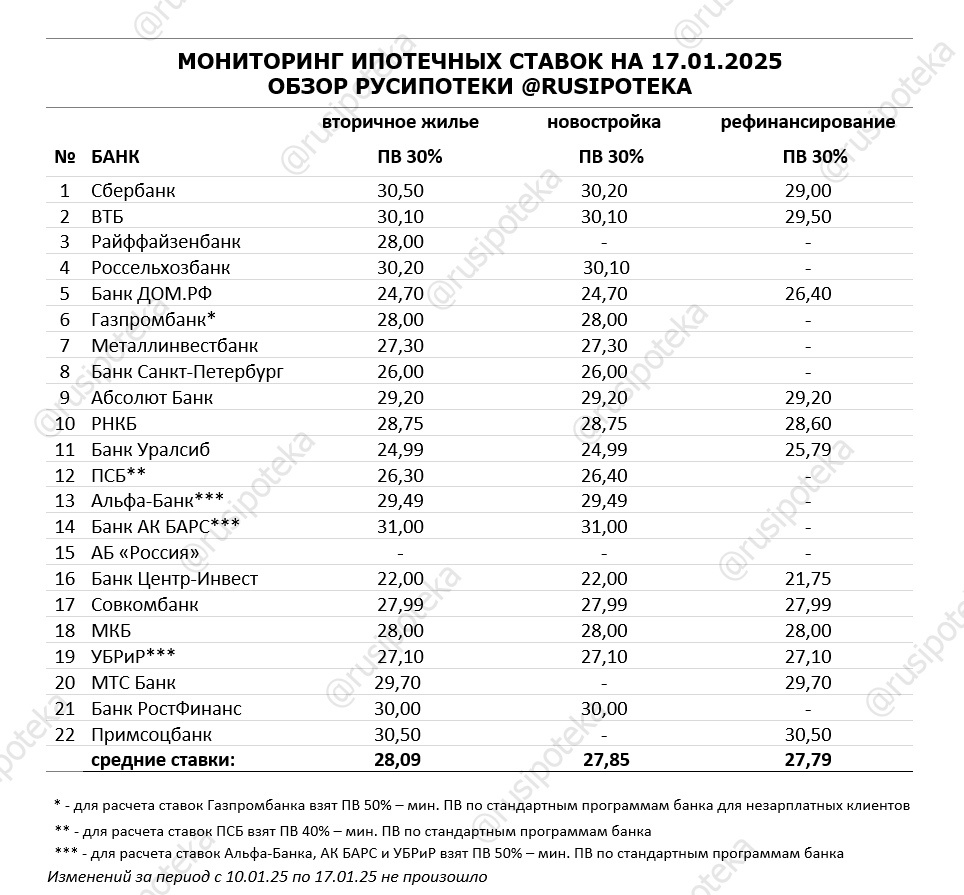 Аналитический центр компании «Русипотека» опубликовал результаты еженедельного мониторинга ипотечных ставок ведущих кредиторов с 10 по 17 января 2025 года. За исходные данные взяты следующие параметры кредита и клиента: Результаты мониторинга минимальных ипотечных ставок в ведущих банках по стандартным программам. Минимальную ставку на новостройки по стандартным программам по данным на 17 января 2025 года предлагали: Минимальная ставка по ипотеке на вторичное жилье у банков: Банки с минимальной ставкой по рефинансированию ипотечных кредитов: Топ-3 банков с минимальной ставкой по семейной ипотеке: Топ-3 банков с минимальной ставкой по военной ипотеке: Топ-3 банков с минимальной ставкой по IT-ипотеке: С оперативной информацией по ипотечному рынку России можно ознакомиться в Telegram-канале компании «Русипотека» @rusipoteka