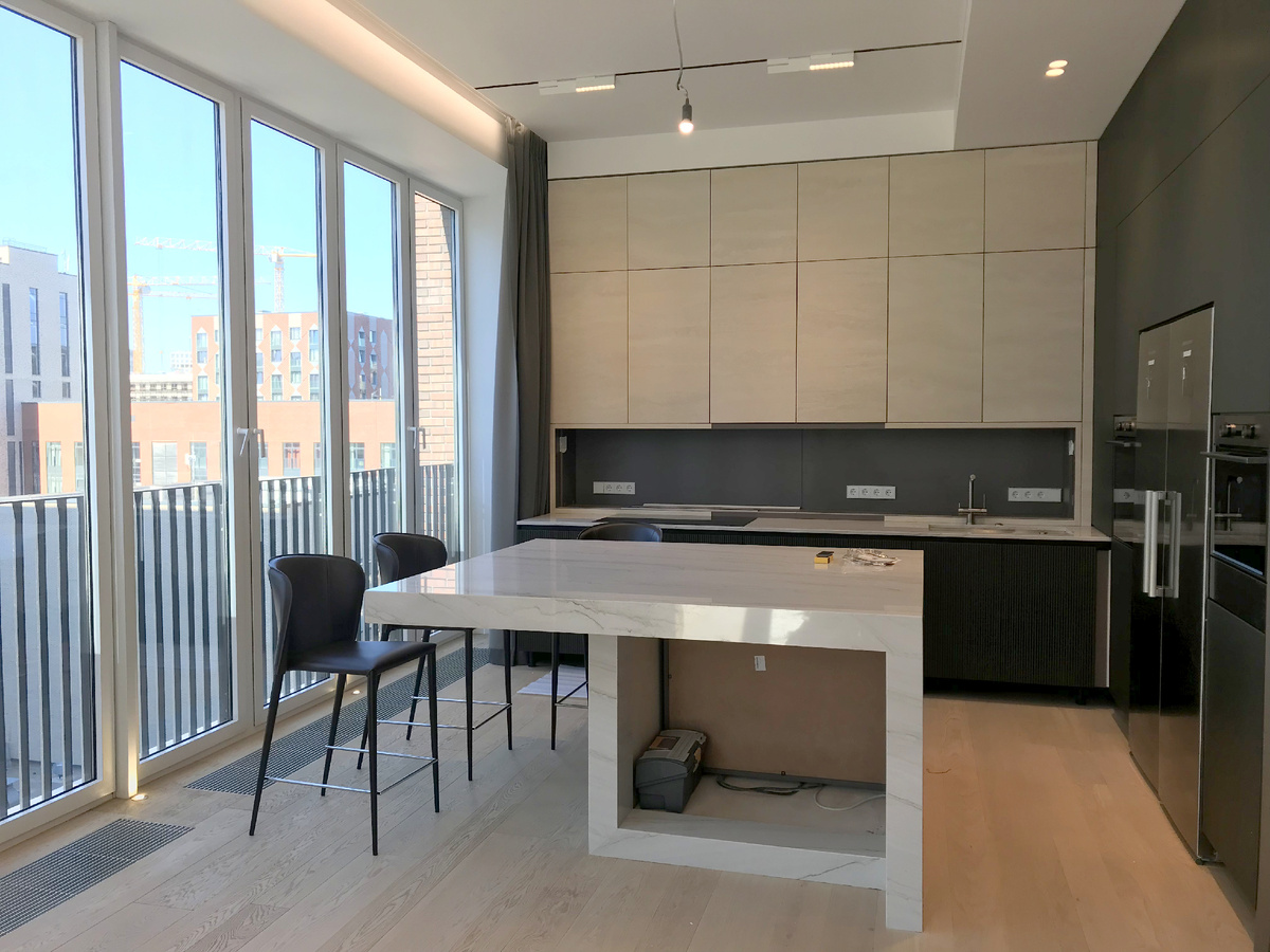 Современный ремонт значительно отличается от того, который мы наблюдали каких-то 5-10 лет назад. Изменился подход: как к выбору и использованию материалов, так и к самому оформлению жилого пространства. Ремонт квартиры и дома давно вышел за рамки простой поклейки обоев и установки мебели. Сегодня владельцы жилья стремятся создать не только красивое, но функциональное пространство, которое будет соответствовать современным тенденциям дизайна. В этой статье подробнее остановимся на трендах и дизайнерских задумках, которые воплощаются в московских квартирах на основе дизайн-проектов. Просторная кухня-гостиная все чаще встречается в современных интерьерах. Максимально открытое пространство без перегородок и межкомнатных дверей выглядит более выигрышно. Оно позволяет использовать разные стилистические подходы в оформлении, помогает персонализировать комнату. Если использовать клишированные решения, то такой интерьер быстро потеряет актуальность и будет неудобным для жильцов. Чтобы реализова