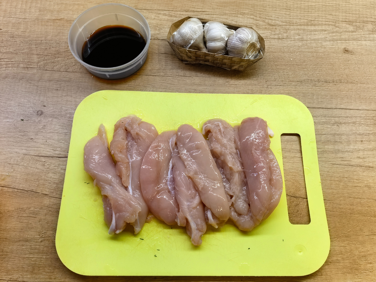 Берем филе курицы. Моем и режем на кубики. На разогретую сковороду выкладываем филе. Добавляем специи,соль, соевый соус,чеснок.
