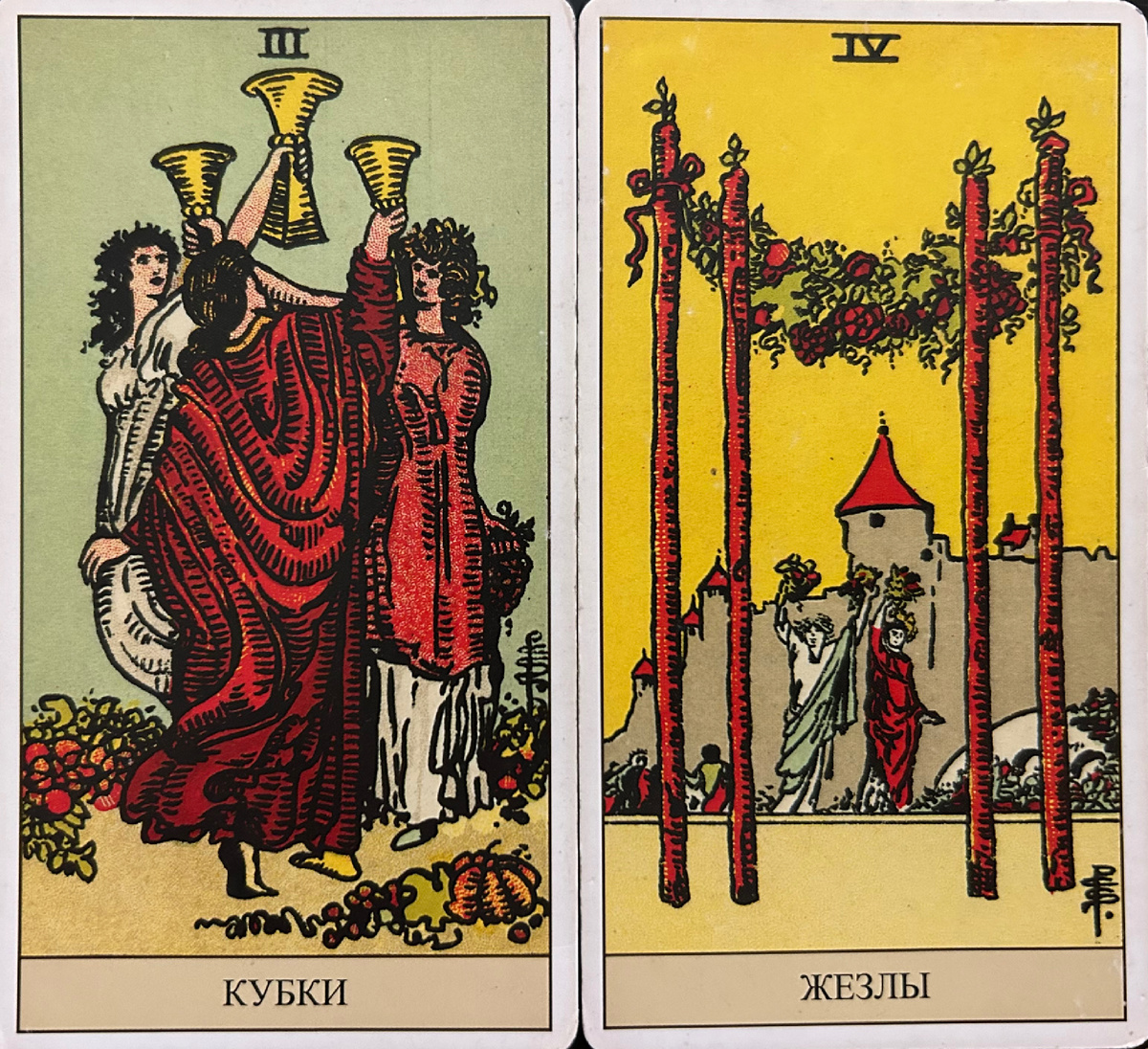 Оба аркана про отношения, дружбу и сплоченность. Разве что у 3 Кубков все проходит более неформально, с бокалом шампанского в руках, а у 4 Жезлов — с серьезными речами и обязательным тостом от родителей.