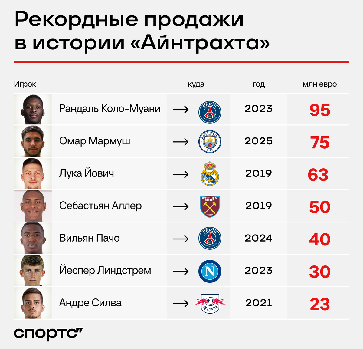 Семь самых больших трансферов франкфуртского клуба состоялись в период с 2019 года. 75 млн за Мармуша – немыслимо, но пару лет назад рекордным был переход Рандаля Коло-Муани за 95 млн.
