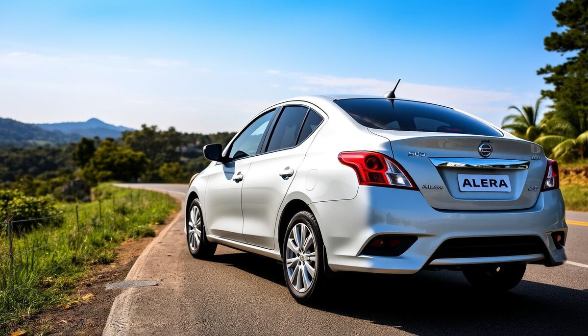 Nissan Almera припарковался на живописной дороге, демонстрируя свой элегантный дизайн и современные функции, в окружении пышной зелени и ясного голубого неба, с акцентом на линиях и изгибах кузова автомобиля