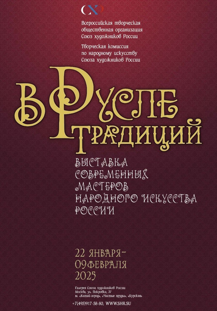 Выставка «В русле традиций. Современные мастера народного искусства России» открылась 22 января в Москве, в Галерее Союза художников России на Покровке, 37 В экспозиции представлены произведения, созданные членами Союза художников России и Народными мастерами РФ, членами творческой комиссии Союза художников России по народному искусству и молодыми мастерам народных промыслов. Лаковая миниатюра Федоскино, Палеха, Холуя, Мстёры, керамика Гжели, Скопина, Вологды, дулёвский фарфор, хохломская и городецкая роспись, жостовские подносы, павловопосадские платки, абашевская, плешковская, петровская, романовская, филимоновская, тульская, дымковская игрушка, тувинская резьба по камню, холмогорская, уэленская, якутская, калмыцкая резьба по кости, искусство народов Кавказа – вот лишь некоторые из народных художественных промыслов России, которые можно увидеть на выставке. Этот впечатляющий ряд произведений художественных промыслов подчеркивает неустанную, каждодневную работу народных мастеро
