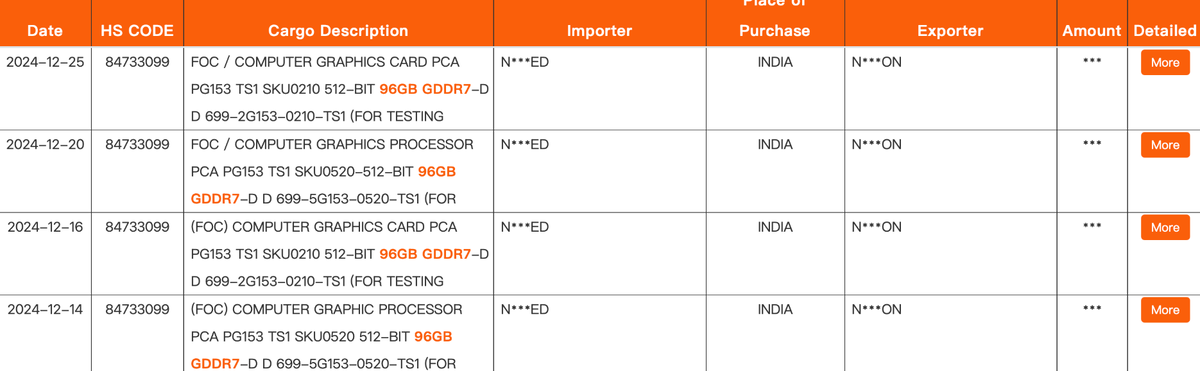 В то время, когда Nvidia вышла на финишную прямую перед релизом своей флагманской видеокарты GeForce RTX 5090, пришло время компании подготовиться к запуску, возможно, более впечатляющего продукта, а именно графической платы следующего поколения RTX 6000 Blackwell для создателей цифрового контента (DCC), профессиональной визуализации и приложений ИИ. Грузовые манифесты, найденные ComputerBase, указывают на то, что новая карта может получить 96 ГБ памяти GDDR7. По данным NBD.ltd, один из экспортеров в декабре отправил в Индию по меньшей мере четыре видеокарты с платой PG153 с 96 ГБ памяти GDDR7, подключенными к графическому процессору с помощью 512-битного интерфейса. Номенклатура PG153 напоминает ту, которую Nvidia использует для своих моделей дополнительных плат, поэтому более чем вероятно, что речь идет об экспортере под названием Nvidia Corporation, отправивший карты Nvidia Graphics Private Limited, своему индийскому филиалу. Хотя официальное название платы неизвестно, это, скорее в
