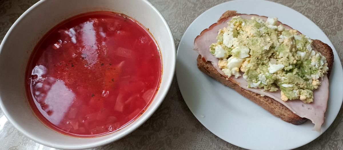 Приветствую вас, друзья, и гости канала. Я худеющая мама трёх мальчишек. Для тех, кто не знает: я завела этот дневник о своей многодетной жизни, а также похудении с 95кг. Моя цель - вернуть себе свой комфортный вес 60кг при росте 172см. Питание четверга: Сегодня очень поздно легла, младший уснул в час ночи, никак не засыпал. Так как ужинаю рано, в семь вечера, ночью был такой нестерпимый голод, что не выдержав, слопала остатки запечённых куриных крылышек без хлеба, без ничего, прям холодными. В счетчик внесла за этот день, но разумеется, не фотографировала. Завтрак, как бы обед, был в половине первого дня, борщ и хлеб с авокадо, яйцом и ветчиной: Второй обед: кофе с молоком и салат овощной с булгуром и домашними фрикадельками, без добавления масла, с соевым соусом. Вечером пачка творога с замороженной клубникой и зелёный чай. Калорийность дня сегодня превышена, но накануне был дефицит, я укладываюсь в средние значения недели. Илюша уснул рано, и я отправила старших купаться, а сама