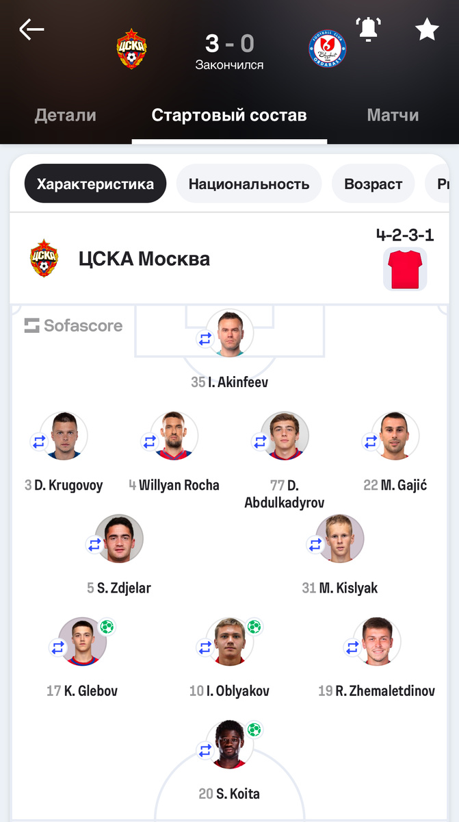 Второй подряд матч команда играет по данной схеме. В том числе статистические ресурсы определяют её именно таковой. В частности, SofaScore, который в первом матче ошибочно определял схему как прежнюю - с тремя цетральными защитниками. На самом деле схема "гибридная". В позиционной обороне и контратаке она именно 4:2:3:1. В первом тайме по умолчанию опорниками были Зделар и Кисляк. Во втором тайме - Пьянич и Мухин. В дебюте позиционной обороны часто 4:3:3. В опорную зону опускались соответственно в первом тайме - Обляков, во втором - Бистрович. Похоже, Кристиян оказался в группе атакующих полузащитников ситуативно, только в связи с травмой Жемалетдинова еще в первом тайме. Не самая удобная для хорвата позиция. Этим, в частности , можно объяснить не самую эффективную игру команды в атаке во втором тайме. Схема SofaScore всё же не совсем точно отображает расстановку игроков на поле, так как по факту Глебов в первом тайме играл больше на непривычном левом фланге. Кстати, довольно удачно