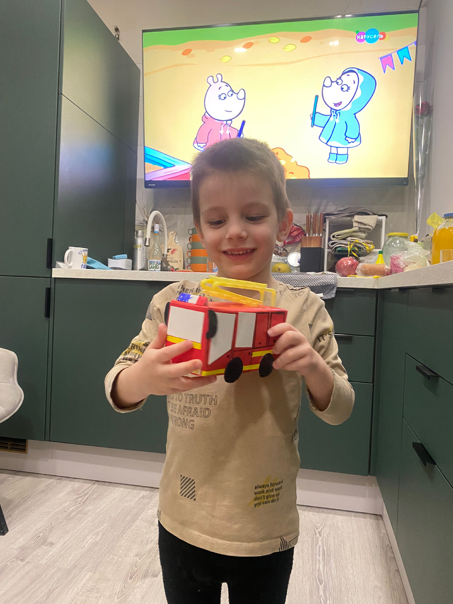 Пожарную машину Тима выбрал сам. Я хотела другую, с которой меньше моей возни и больше его занятость, но детское вдохновение, оно такое… Делали из старой коробки от новогодних фонариков, которые он сломал еще до праздника 😹