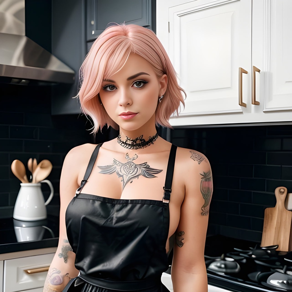 На его кухне стояла девушка. Её волосы были окрашены в нежно-розовый цвет, а её лицо выглядело обманчиво по-детски, но в то же время проглядывалось, что ей уже точно больше двадцати лет. Яркие татуировки на плечах и руках придавали ей необычный вид, но при этом она оставалась очень симпатичной. Чёрное короткое платьице дополняло образ, и татуировки выглядывали из-под него, словно играли в прятки.