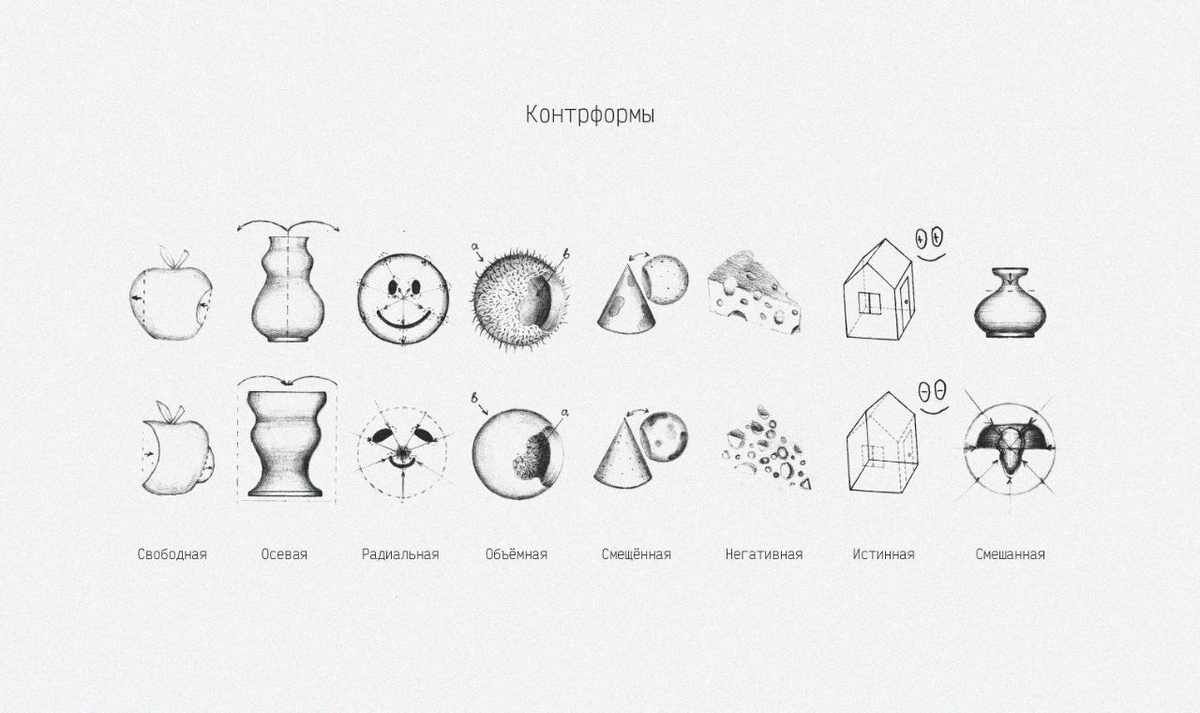 Ниже представлены композиции из контрформ реальных объектов. Чтобы понять какие именно объекты нарисованы, следует мысленно или графически вывернуть их так, как показано на схеме выше. Попробуйте понять, что мной изображено и поделитесь версиями в комментариях.